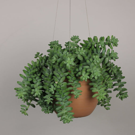 Discover the allure of Burro's Tail (Sedum morganianum), a captivating succulent that belongs to the Sedum genus, known for its trailing stems and distinctive triangular-shaped fleshy blue-green leaves. This evergreen perennial is ideal for hanging containers, showcasing trailing stems that can reach up to 24 inches in length. The delicate leaves, while visually stunning, are sensitive to heavy foot traffic and may break off if manipulated. Burro's Tail is a native of Mexico and the Dominican Republic, thriving in high light interior environments, making it a perfect addition to windowsills with partial sun exposure.