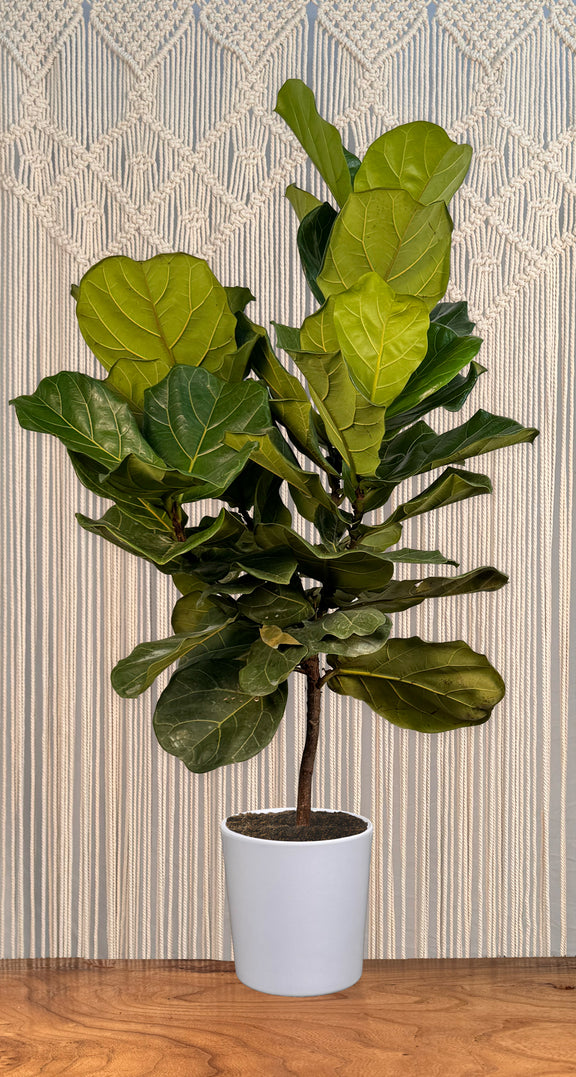 Elevate your indoor space with the captivating Fiddle-Leaf Fig (Ficus lyrata), a popular broadleaf evergreen known for its large, glossy, violin-shaped leaves that grow upright on a sleek trunk. Native to tropical western Africa, this striking plant is often chosen as a focal point, reaching heights of around 10 feet indoors, with a potential outdoor height of 50 feet. Perfect for floor-standing containers, the fiddle-leaf fig adds a touch of elegance to any room, but it's important to note that it is toxic to cats and dogs