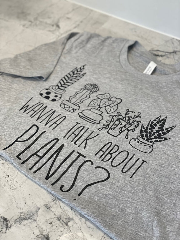 Lightweight heather gray tee. Black ink printed design. Wanna Talk About Plants?